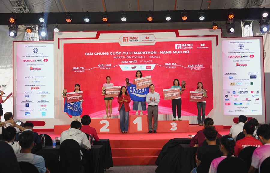 Ông Phạm Xuân Tài – Phó Giám đốc Sở Văn hóa và Thể thao TP Hà Nội và Bà Thái Minh Diễm Tú – Giám đốc Khối Tiếp thị Techcombank Trao giải cho các VĐV xuất sắc nhất đường đua Marathon Nữ
