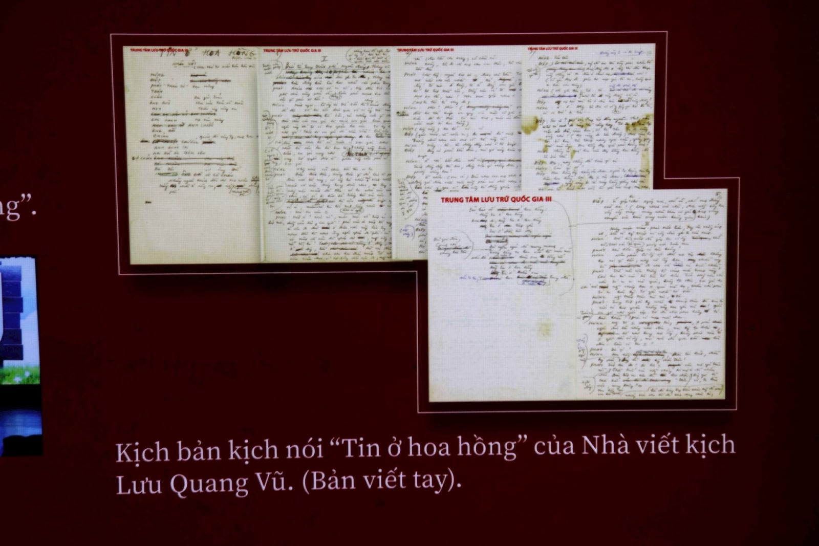 Những hình ảnh từ thời trẻ, những trang bản thảo, thư tay... của nhà viết kịch Lưu Quang Vũ; nhà văn, nhà viết kịch Đào Hồng Cẩm; nhà hoạt động sân khấu Lộng Chương; Phó Giáo sư, Tiến sỹ, đạo diễn, Nghệ sỹ Nhân dân Ngô Mạnh Lân; nhà văn, nhà viết kịch Nguyễn Tất Đạt; Tiến sỹ, nhà viết kịch Trần Đình Ngôn; nhà văn, nhà viết kịch Học Phi; nhà thơ, nhà biên kịch Nguyễn Thị Hồng Ngát... đã được trưng bày tại Triển lãm.